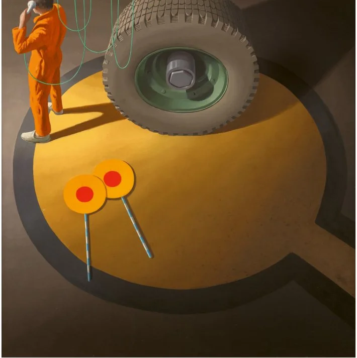 "In reducing the vast scale of an airport to that of a single man, Jeffrey Smart zooms in on a small pictorial incident, concentrated in the pool of light in the top left-hand corner of the canvas. Through a sophisticated interplay of surfaces and diagonals of light and shadow, Smart skilfully draws the eye to the startlingly white phone handset and to the mysterious communication with the outside world that it implies."